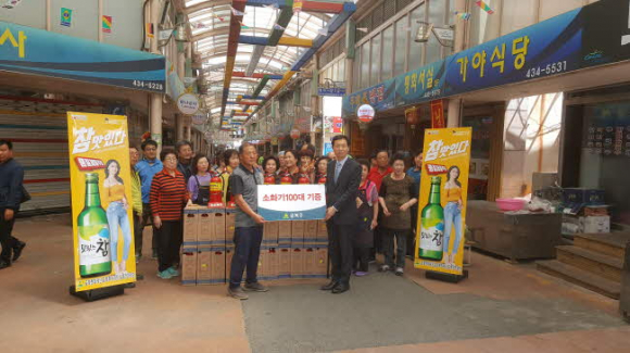 (주)금복주 구미지점(지점장 이승주)은 5월 15일(화) 오후 2시 김천시 평화시장에서 전통시장 화재예방을 위한 소화기 기증 행사를 가졌다.