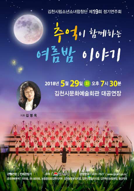 김천시문화예술회관(관장 장귀희)에서는 오는 5월 29일(화) 오후 7시 30분에 대공연장에서 ‘추억이 함께하는 여름밤 이야기’라는 부제로 김천시립소년소녀합창단 제19회 정기연주회를 개최한다.