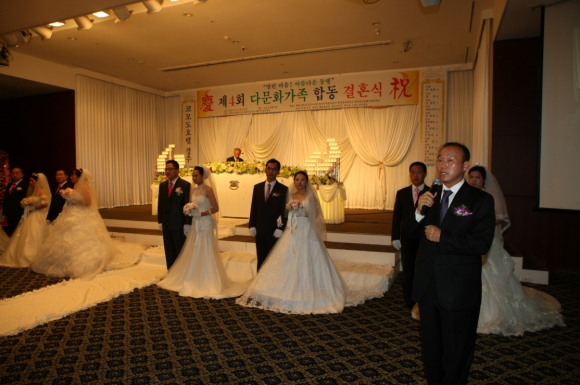 황윤기 전 국회의원의 주례로 진행되는 합동결혼식에는 다문화가정 여섯 쌍이 식단에 올라 하객들의 축복 속에 혼인서약을 했다.