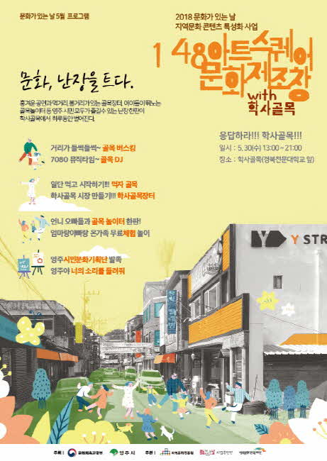 (재)영주문화관광재단은 ‘2018 문화가 있는 날 지역문화 콘텐츠 특성화 사업’에 2년 연속 선정되어 5월부터 10월까지 매달 마지막 수요일에 영주 시민을 대상으로 148아트스퀘어와 학사골목에서 문화행사를 추진한다.