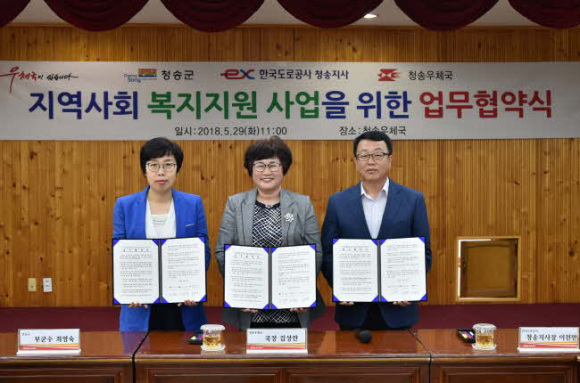 청송군·청송우체국·한국도로공사 청송지사가 지난 29일(화) 청송우체국에서 맞춤형 복지지원 업무협약(MOU)을 맺고 지역의 사회복지 지원사업에 적극 나서기로 합의했다.