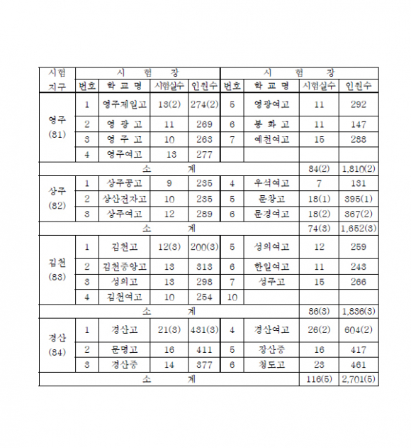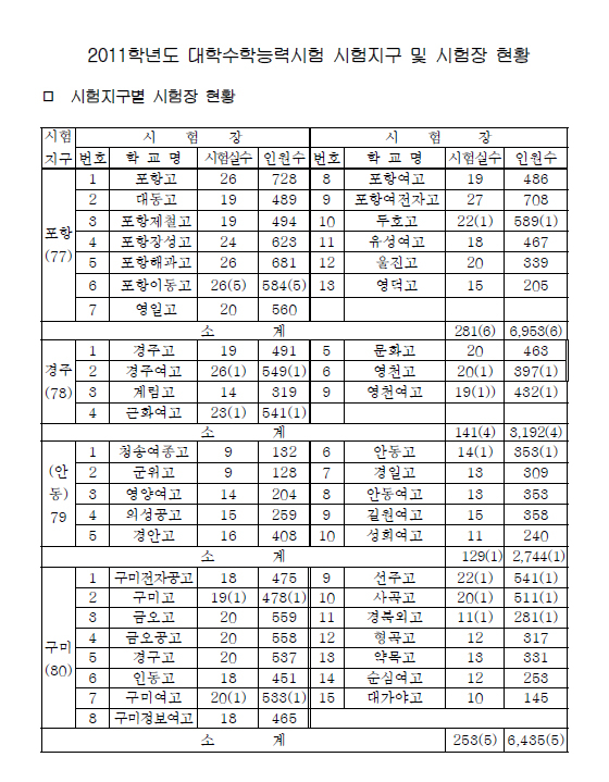 11. 18.(목)에 실시되는 2011학년도 대학수학능력시험은 도내 22개 시ㆍ군에 설치된 71개 시험장에서 27,323명이 응시하게 되며