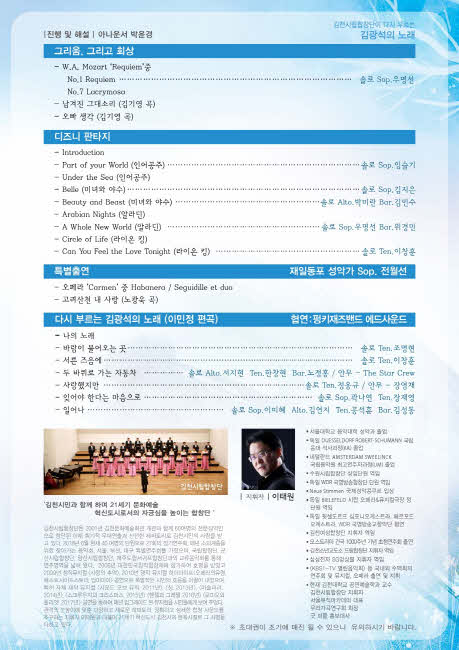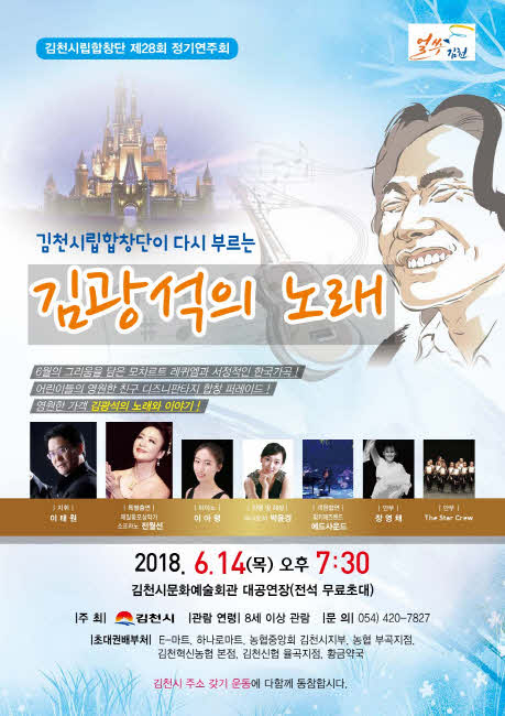 장귀희 김천시문화예술회관장은 “그리움의 달, 유월에 개최되는 합창단 정기연주회에 가족 모두 함께 오시어 디즈니판타지 노래와 김광석 노래 퍼레이드로 추억 가득한 시간 되셨으면 좋겠다.”고 전했다.