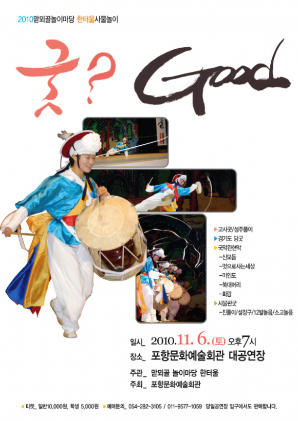 ‘굿 ? Good!’은 근래에 보기드문 이색적인 공연으로, 우리나라 전통 굿이 무엇인가라는 의문을 제기하고, 굿의 정신을 담아낸 사물놀이 한마당을 통해 맺힌 것을 풀어내 신명나는 삶으로 인도한다는 ‘굿은 좋은 것’이라는 의미를 담아내고자 했다.