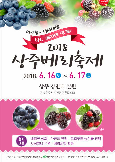 FTA 등 농산물 수입개방화 시대에 국내 베리농가의 경쟁력 강화를 위한 ‘제3회 상주베리축제’가 6월 16.(토) ~ 6. 17.(일) 상주시 경천대 일원에서 개최된다.