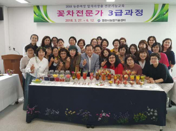 영천시는 농촌여성 일자리창출 전문기능교육의 일환으로 꽃차전문가 3급 자격취득과정 교육을 지난 3월 27일부터 이달 12일까지 총 12회에 걸쳐 농업기술센터에서 실시했다.