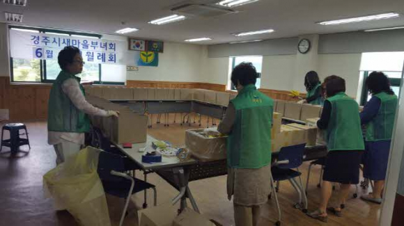 경주시새마을회(회장 손지익)에서는 6월 16일(목) 오전 11:00 읍면동 부녀회장 24명이 참석한 가운데 경주시새마을회관에서 매달 하는 어려운세대 밑반찬을 만들어 전달하기 대신 6월에는 생필품을 세트로 만들어 전달했다.