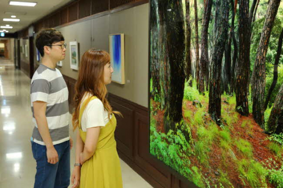 한편 미술관 내 미로 같은 작은 전시실들을 거쳐 제3실에 들어서면 예상치 않은 작품을 만나게 된다. 최근 SNS상에서 핫한 포토 스팟으로 떠오르고 있는 곳이다. 제3전시실의 벽면을 틔워 통 유리창으로 만든 프레임 속에 아평지 연못과 주변 자연경관을 그대로 담아 한 폭의 미술작품처럼 관람할 수 있도록 한 ‘움직이는 그림’은 기존 미술관과 차별화되는 신선함을 느끼게 한다.
