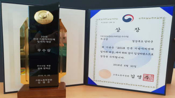 영덕군이 지난 20일 정부세종컨벤션센터에서 열린 ‘2018 전국 지방자치단체 일자리 대상’ 시상식에서 지역산업맞춤형 일자리창출 우수사업 부문 우수상을 받았다.