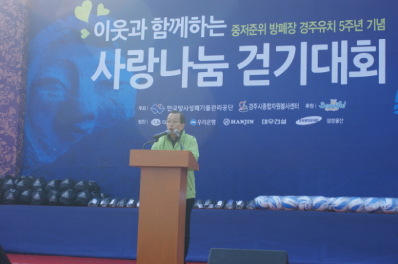 한국방사성 폐기물관리공단(민계홍 이사장)과 경주시 종합자원봉사센터에서 주최하고 경주시가 후원하는 ‘이웃과 함께하는 사랑나눔 걷기대회’가 최양식경주시장, 김일헌시의회의장과 공단관계자와 시민과 학생 2000여명이 참여한 가운데 10월 13일 오전9시에 경주국립박물관에서 열렸다.