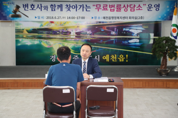 예천군에서는 27일 오후 2시부터 5시까지 예천읍행정복지센터 2층 회의실에서 일상생활 속 법률고민에 대한 군민들의 고충을 덜어주기 위해 경상북도 주관 찾아가는 무료법률 상담실을 운영했다.