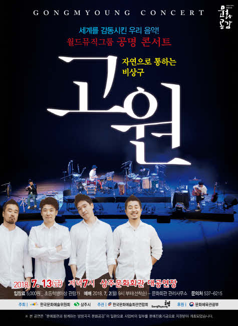 상주시는 7월 13일 저녁 7시 상주문화회관 대공연장에서 월드뮤직그룹 공명콘서트 『자연으로 통하는 비상구 “고원(Plateau)"』공연을 선보일 예정이다.