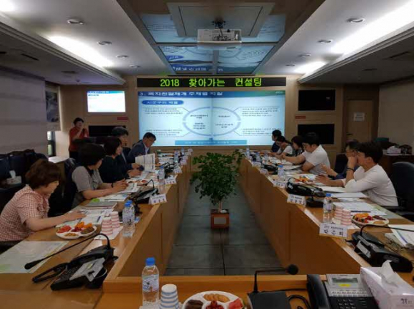 성주군(군수 이병환) 주민복지과 희망복지지원단에서는 7월 3일(화) 『2018년 찾아가는 컨설팅』을 3개 권역 맞춤형 복지팀과 외부 전문가들이 직접 참여하여 성주군 찾아가는 보건복지서비스 정책방향 및 사례관리에 대한 전문적인 컨설팅을 실시했다.