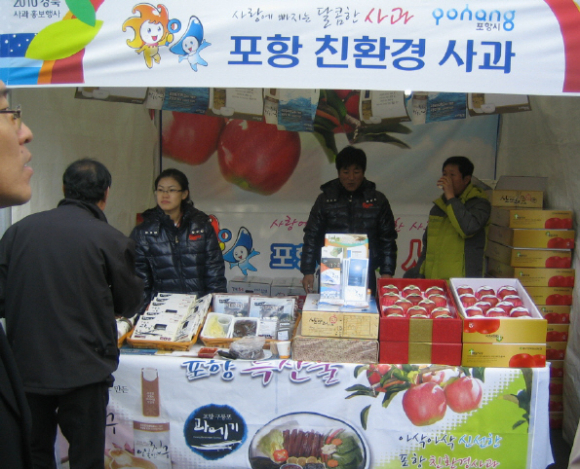 포항시가 16일부터 18일까지 3일간 부산역 광장에서 열리고 있는 2010 경북사과 홍보행사에 참여해 포항 사과와 우수특산물 알리기에 나섰다.