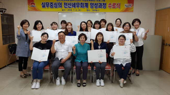 김천시평생교육원에서 운영하는 여성새로일하기센터(센터장:김금숙)는 2018. 7. 4(수) 직업교육훈련과정(실무중심의 전산세무회계 양성과정) 수료식을 개최했다.