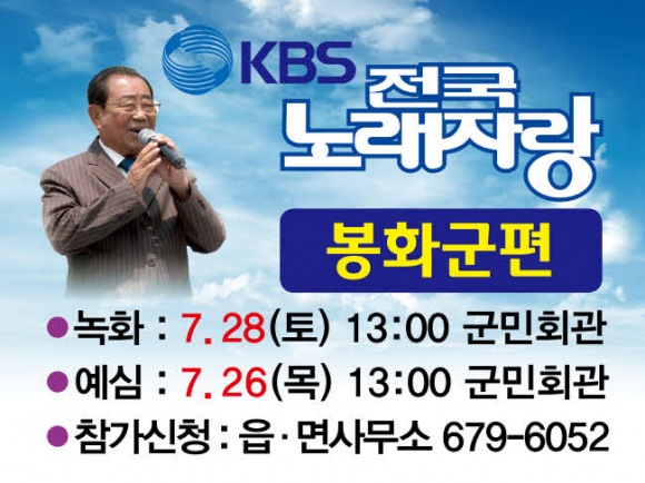 봉화군(군수 엄태항)은 KBS 전국노래자랑 봉화군편에 나갈 참가 신청자를 7월 24일(화)까지 모집한다.