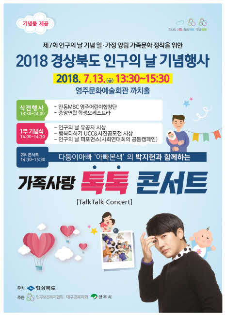 경상북도가 주최하고 인구보건복지협회 대구·경북지회와 영주시 주관으로 개최하는 이번 인구의 날 기념식은 일・가정 양립 가족문화 정착을 위한 ‘출산장려 문화 확산의 사회적 분위기 조성에 앞장서기 위해 유공자 시상, 퍼포먼스, 톡톡콘서트, 홍보&체험부스 운영 등 다양하게 진행될 예정이다. 식전공연으로는 안동MBC영주어린이합창단, 중앙연합오케스트라 연주가 있을 예정이고 가족사랑 톡톡콘서트에는 다둥이 아빠 “아빠 본색”의 박지헌(가수, 現VOS그룹 멤버)이 출연해 “가족 서로의 마음간격 좁히기/감사표현 실행의 힘 깨닫기”라는 주제로 특강을 할 예정이다.