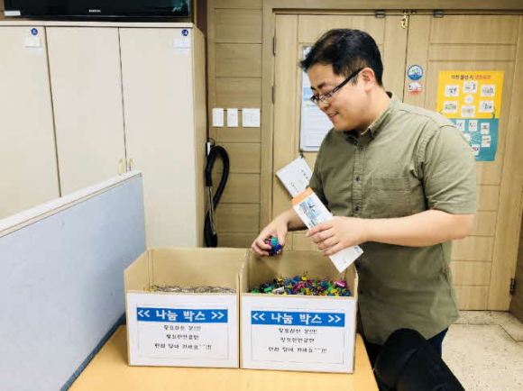 이렇게 모인 클립 등의 사무용품을 단순히 재활용통으로 보내는 것이 아니라 필요한 내방객 및 각 부서에 나눠주면 더 좋을 것이라는 직원들의 의견을 수렴해 사무용품 ‘나눔 박스’를 만들어 필요한 용품들을 누구나 가져가서 쓸 수 있도록 했다.
