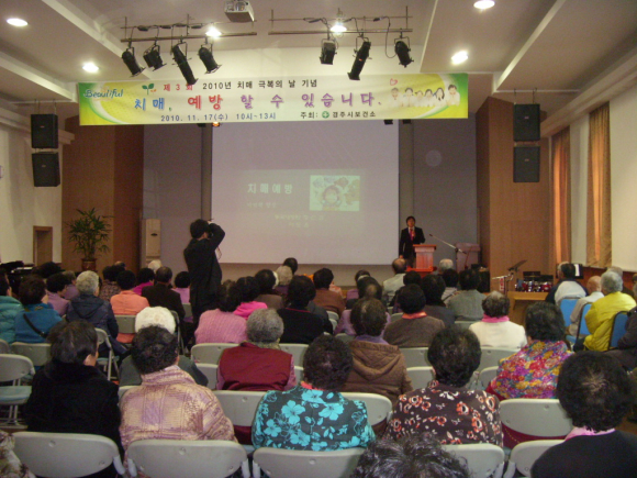 경주시 보건소(소장 김미경)는 치매극복의 날 기념으로 11월17일(수) 10:00~13:00 경주제일교회에서 경로대학생 150여명을 대상으로 치매와 심뇌혈관질환예방이라는 주제로 교육을 실시하였다.