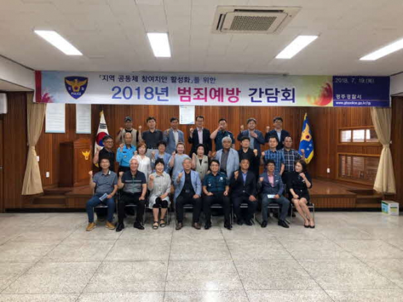경주경찰서(서장 배기환)에서는 지난 7월 19일 오후 3시 경주경찰서 3층 대회의실에서 경찰협력단체, 유관단체장, 지자체 관계자 등 30여명이 참석한 가운데 민생치안 역량강화 및 공동체 참여치안 활성화를 위한“2018년도 범죄예방 간담회”를 개최했다.