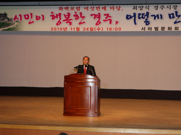 2010년 11월 24일 16:00시. 서라벌 문화회관에서 화백포럼 여섯 번째 마당이 열렸다. 7월 1일 민선5기 경주시장으로 취임한 최양식 시장은 이날 특강을 통해 경주를 사랑하는 방법과 경주의 비전에 대한 진솔한 강의로 시민들의 큰 호응의 얻었다. 이날 특강에는 주요 지역 기업 CEO 및 임원, 사회단체 지도자급 인사와 언론인, 시민 등 600여명이 참석했다.