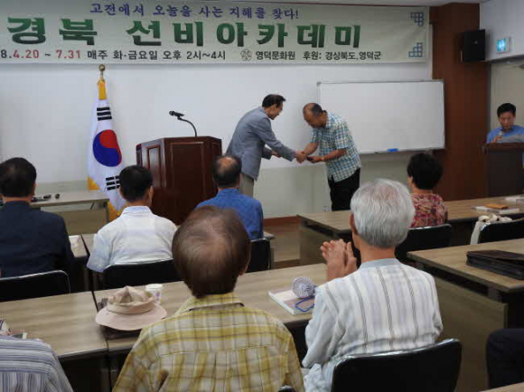 경북선비아카데미 수료식이 7월 31일 영덕문화원에서 열려 수강생 65명이 수료증을 받았다. 이에 앞서 계명대학교 노종국 교수가 ‘한국 고대문화의 이해’라는 주제로 마지막 강연을 했다.