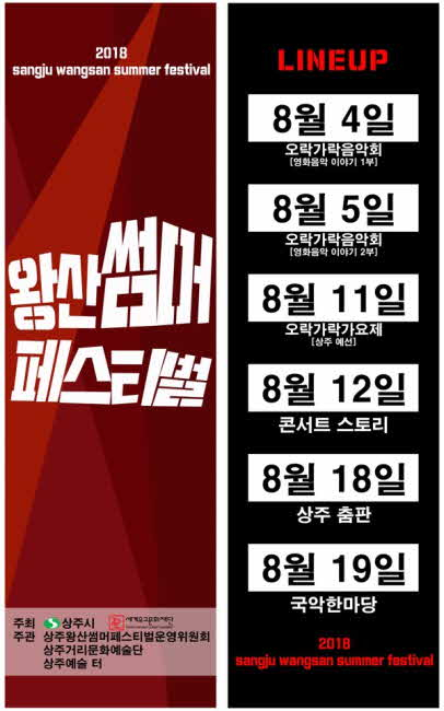상주시 관계자는 “무더운 여름을 맞아 상주의 역사가 깃들어있는 왕산역사공원에서 멋진 공연과 함께 더위를 날려버리고 즐거운 시간을 보내시기 바란다.”고 말했다. |