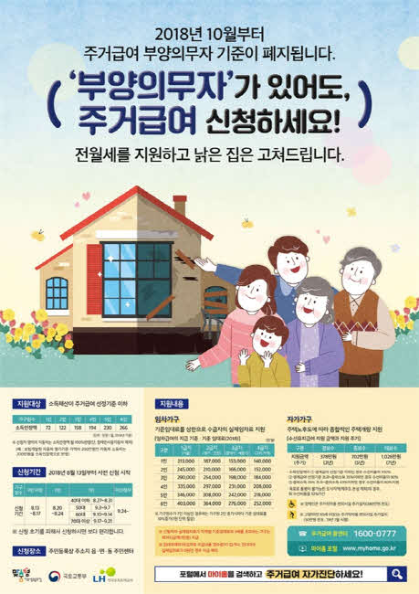 주거급여는 소득·주거형태 및 주거비부담 수준 등을 종합적으로 고려하여 저소득층의 주거비를 지원하는 제도로서, 지금까지 주거급여의 수급권자는 부양의무자가 없거나 부양의무자가 있어도 부양능력이 없는 경우에 수급이 가능했지만, 10월부터는 수급권자의 부양 의무자 기준이 폐지됨에 따라 소득인정액 기준만으로 주거급여를 받을 수 있게 된다.