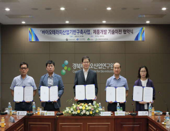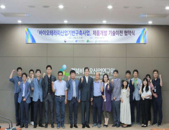 경북바이오산업연구원(이하 연구원)은 21일 오전 11시 연구원 대회의실에서 이택관 연구원장, 가가표고라 외 3개 기업체 대표 및 사업관계자 등이 참석한 가운데 “바이오테라피산업기반구축 3차년도 제품개발 기술이전 협약식”을 개최했다.