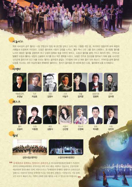 이 공연은 나당 연합군 침입으로 눈이 멀게 된 사비성 공주 ‘월아’, 그녀를 사랑하는 청년 ‘도림’, 월아를 노리는 호족 ‘해장’, 도림을 흠모하는 ‘버들이’가 줄거리를 이끌어 나간다. 또한 김천시립교향악단과 스칼라오페라합창단이 협연하며, 30년 내공이 쌓인 호남오페라단의 배우들과 연주자들의 출중한 기량을 엿볼 수 있을 것이다.
