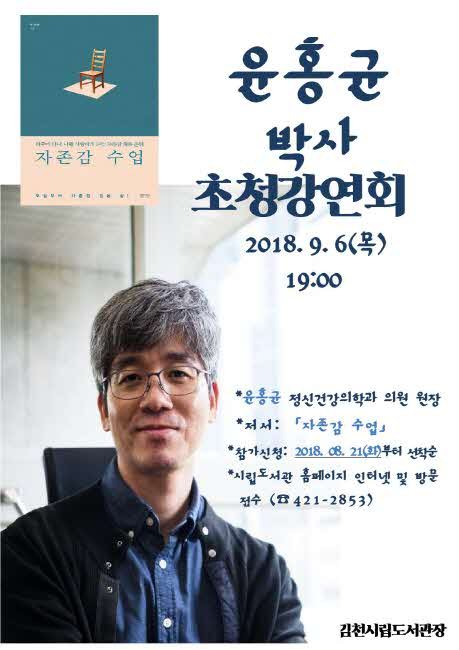 김천시립도서관(관장 장귀희)에서는 9월 6일(목) 오후 7시 시립도서관 시청각실에서 베스트셀러 <자존감 수업>의 저자 윤홍균 박사를 초청하여 강연회를 개최한다.