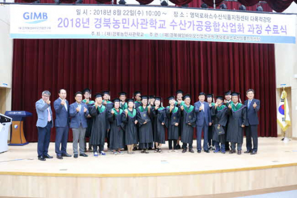 2018년 경북농민사관학교 수산가공 융합산업화과정 수료식이 지난 22일 영덕로하스수산식품지원센터 다목적강당에서 열렸다. 수료증을 받은 교육생 19명은 수산가공융합분야 전문인력으로서 지역 농수산업 경쟁력 강화와 산업발전에 기여할 것으로 전망된다.