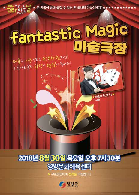 영양군(군수 오도창)에서는 8월 30일(목) 오후 7시 30분 영양문화체육센터에서 8월 문화가 있는 날 “판타스틱 매직“ 공연을 개최한다.