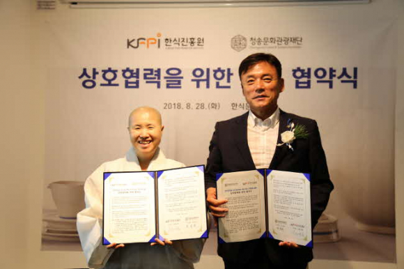청송문화관광재단(이사장 윤경희)과 한식진흥원(이사장 선재)이 지난 28일(화) 서울 중구에 위치한 한식문화관에서 업무협약(MOU)을 체결했다.