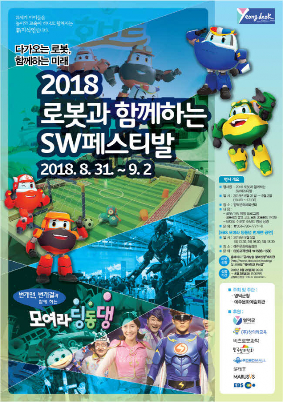 영덕군 어린이들을 위한 다채로운 행사가 올 여름의 끝자락을 장식한다. ‘2018 로봇과 함께하는 SW페스티발’이 8월 31일(금)부터 9월 2일(일)까지 영덕문화체육센터에서 개최된다. 9월 5일(수)에는 예주문화예술회관에서 ‘번개맨, 번개걸과 함께하는 EBS 모여라 딩동댕’ 공개방송이 총 3회(13:30, 16:00, 18:30) 있을 예정이다.