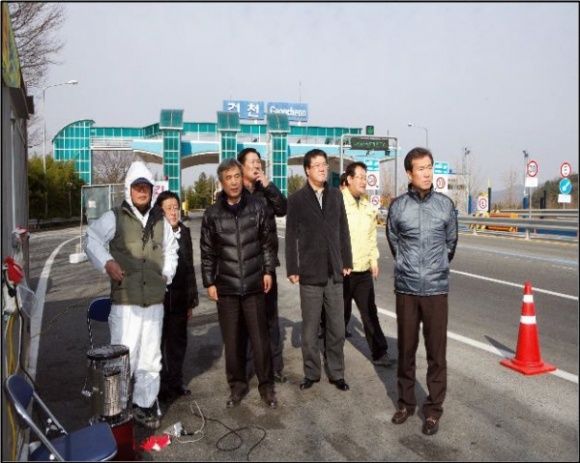 경주시의회 경주도시위원회(위원장. 권영길) 위원들은 지난 11. 29일 안동에서 발생한 구제역으로 인한 농가피해와 확산방지 등을 위하여 설치한 건천 IC 등 구제역 방역초소를 방문하여 간식과 음료수 등을 전달하고 추운 날씨에 노고가 많은 근무자 격려 및 현장 근무환경 등을 세심하게 살폈다.