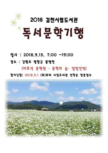 김천시립도서관(관장 장귀희)에서는 9월 15일(금), 강원도 평창으로 독서문학기행을 함께 떠날 도서관 회원 40명을 선착순으로 모집한다.