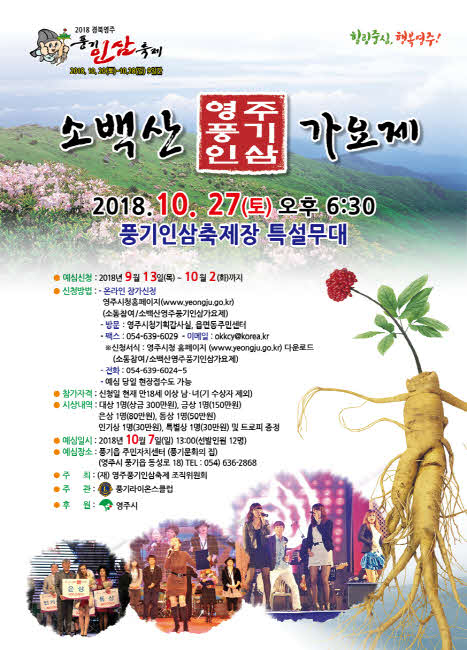영주풍기인삼축제조직위원회가 주최하고 풍기라이온스클럽이 주관하는 ‘2018 소백산 영주풍기인삼가요제’에 참가할 주인공들의 참가신청을 받고 있다.