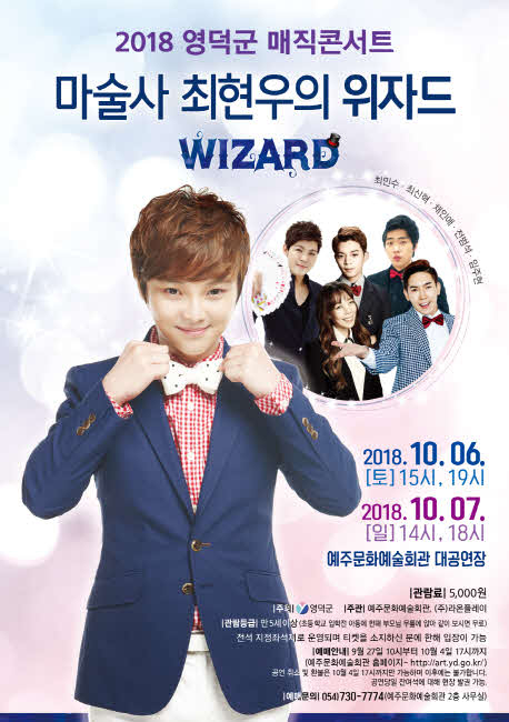 영덕군 예주문화예술회관은 오는 10월 6일(토) 15시, 19시와 10월 7일(일) 14시, 18시에 「마술사 최현우의 위자드」공연을 개최한다. 대도시에서 주로 공연되는 매직콘서트가 최초로 군에서 개최되고 관람료가 5천원으로 매우 저렴해 많은 군민이 즐길 수 있을 것으로 기대된다.