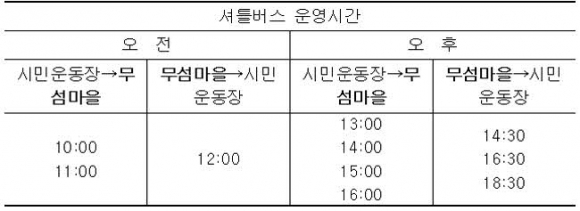올해는 부족한 대중교통을 해소하고자 영주시민운동장과 무섬마을 행사장을 오가는 셔틀버스가 운영된다. 셔틀버스 시간은 다음과 같다.