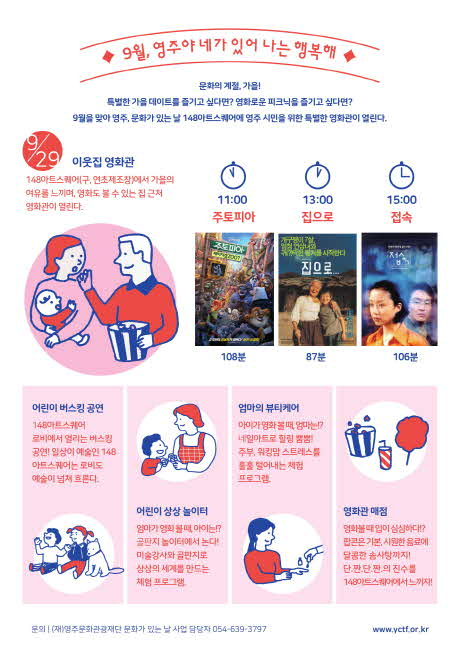 명절연휴 피로해진 몸과 마음을 재충전하는 힐링 영화를 편하게 누워 감상하는 ‘이웃집 영화관’과 어린이들이 마음껏 즐길 수 있는 미술놀이터, 만들기 체험 놀이, 마술과 인형극이 어우러진 ‘어린이 버스킹 공연’이 펼쳐진다.
