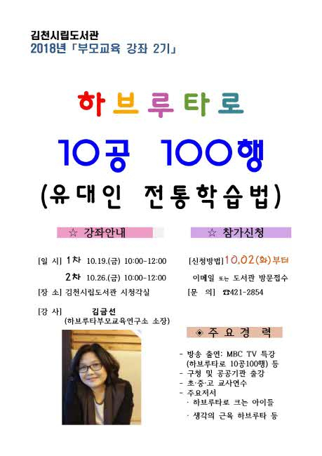 김천시립도서관(관장 장귀희)에서는 10월 19일(금), 26일(금) 오전 10시 시청각실에서 김금선 강사(하브루타부모교육연구소 소장)를 초청하여 강연회를 개최한다.