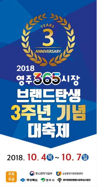4일부터 6일까지 진행하는 이번 행사는 2016년 10월 4일 영주365시장 브랜드 선포 이후 3년에 걸쳐 뛰어난 사업성과를 통해 전국 우수 문화관광형시장으로 성장한 영주365시장 브랜드를 상인 및 고객과 함께 기념하기 위해 마련됐다.