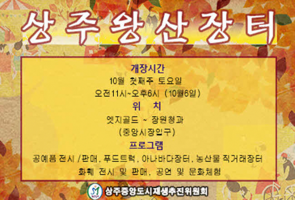 지역의 문화생활 제공과 상권 활성화를 위해 매월 둘째주 토요일 개최되는 상주왕산장터 행사가 이번 달은 한주를 앞당겨서 첫째주 토요일인 10월 6일 상주 남성로 구간에서 열릴 예정이다.