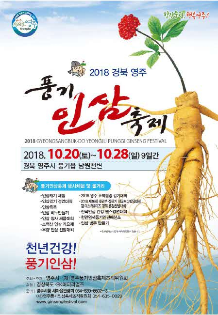 이번 축제는 자매도시인 일본 후지노미야시 북춤, 소백힐링걷기대회, 천연염색 풍기인견 패션쇼, 평양예술단 공연, 전국 보디빌딩대회, 인삼깎기 대회 등 공연과 경연대회로 다양한 볼거리를 제공한다.