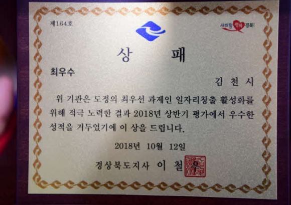 김천시(시장 김충섭)는 경북도에서 주관하는 2018년 상반기 일자리창출 추진실적 도내 시‧군 평가에서 최우수기관으로 선정되어, 12일 도청에서 열린 시상식에서 기관표창과 시상금 2백만원을 수상하는 쾌거를 이루었다.