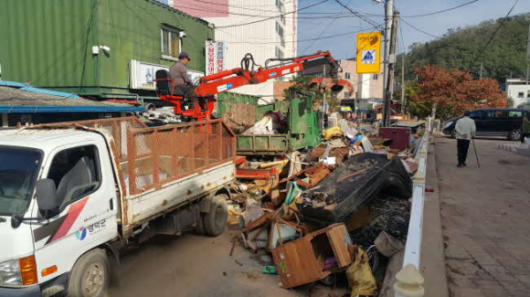 군청 환경위생과는 10월 7일 주택침수 피해가 집중된 강구면에 현장 상황실을 설치하고 생활쓰레기 수거 등 환경정비작업에 돌입했다.
