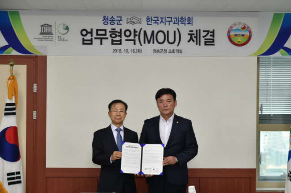 청송군(군수 윤경희)과 한국지구과학회(회장 경재복)가 지난 16일(화) 청송군청 소회의실에서 청송 유네스코 세계지질공원의 효율적 운영방안 모색을 위한 업무협약을 체결했다.