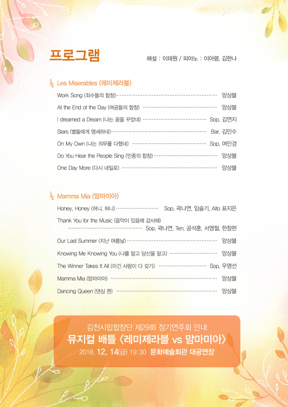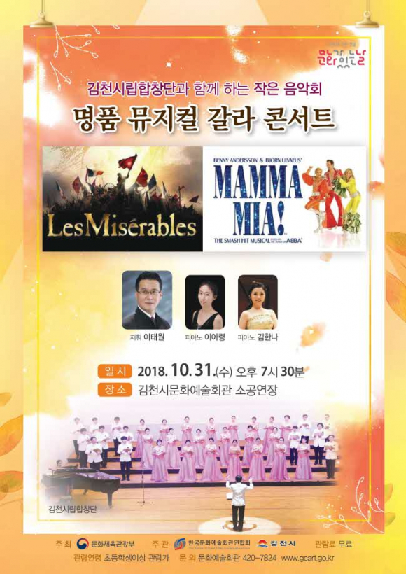 이 공연은 문화체육관광부가 주최하고 한국문화예술회관연합회와 김천시가 공동 주관하여 연중 진행하는 국비지원 사업으로 이날 공연에 명작 뮤지컬 ‘레미제라블’과 ‘맘마미아’의 주요 곡들을 40여명의 전문성악인으로 구성된 김천시립합창단 단원들의 섬세한 목소리를 통해 감상할 수 있다.