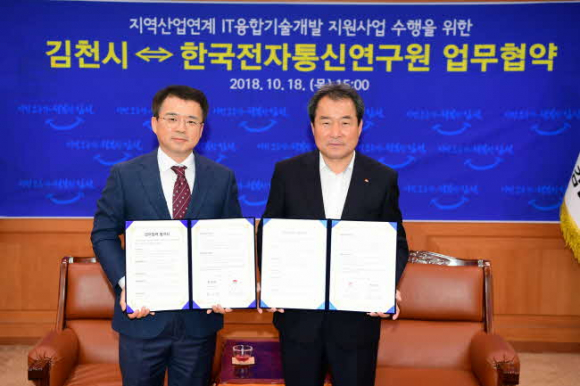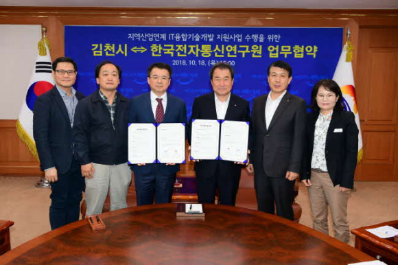 김천시는 지난 18일 한국전자통신연구원과‘지역산업연계 IT융합기술개발지원사업’수행을 위한 유기적인 협력체계를 구축하기 위하여 업무협약을 체결했다.
